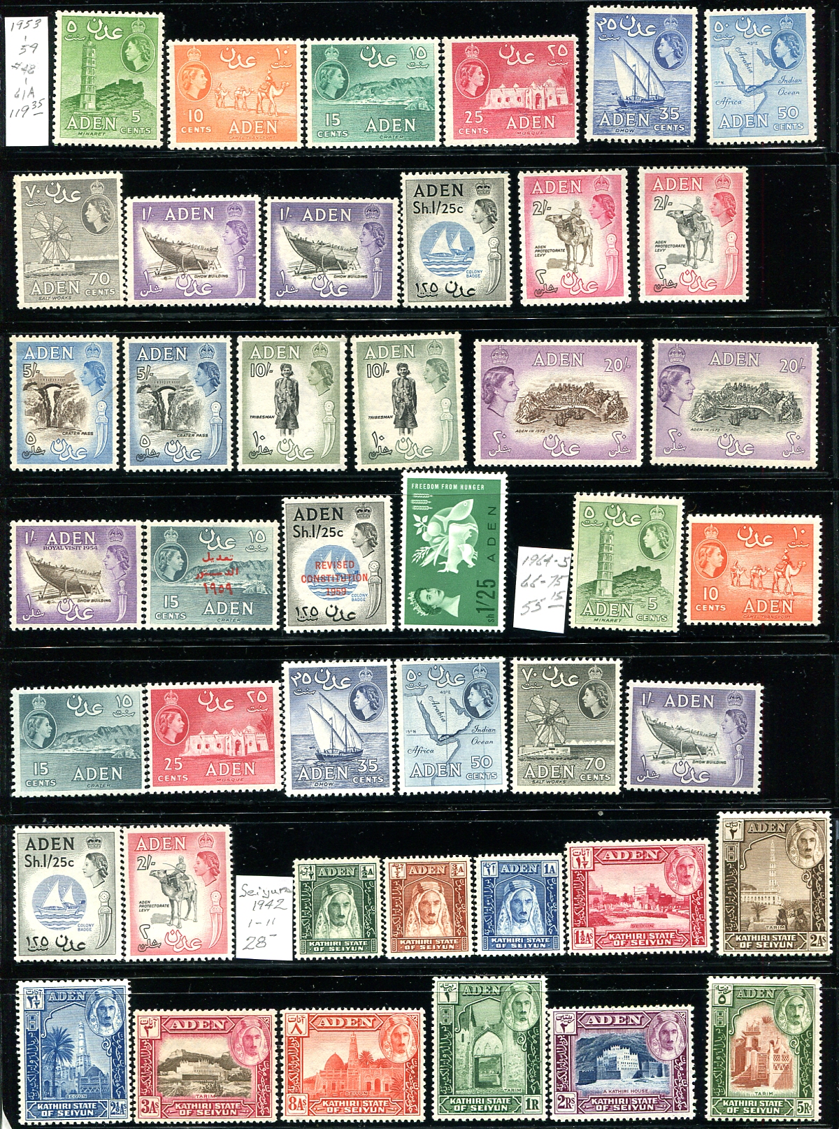 Attractive mint Lightly Hinged / Never Hinged selection of 154 different stamps from the 1937-1965 era, neatly arranged and identified on two double-sided stockpages. Several better including George VI, Silver Wedding, complete sets, surcharges etc. 2026 Scott US$626.65 =