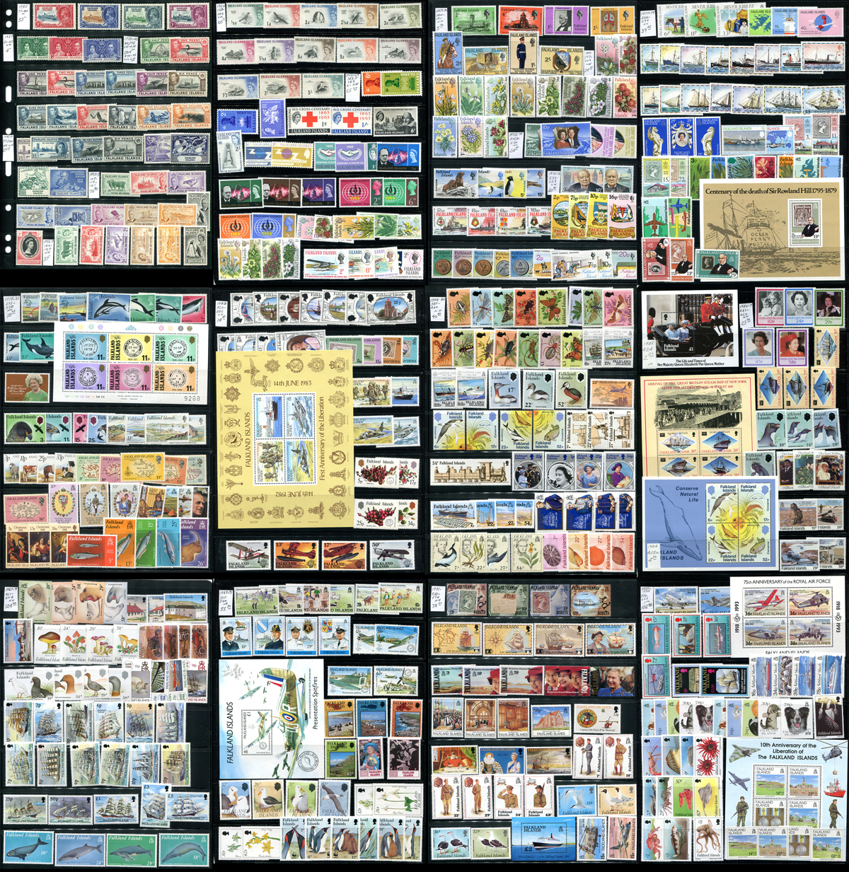 Marvelous mint collection of Falkland Islands, from 1935-1994 with 503 different stamps (including 9 souvenir sheets). A lovely run of singles and sets, largely complete for the period, all laid out and identified on 6 double-sided stockpages. Generally Lightly Hinged up to 1955, then Never Hinged thereafter. 2026 Scott US$1235.15 =