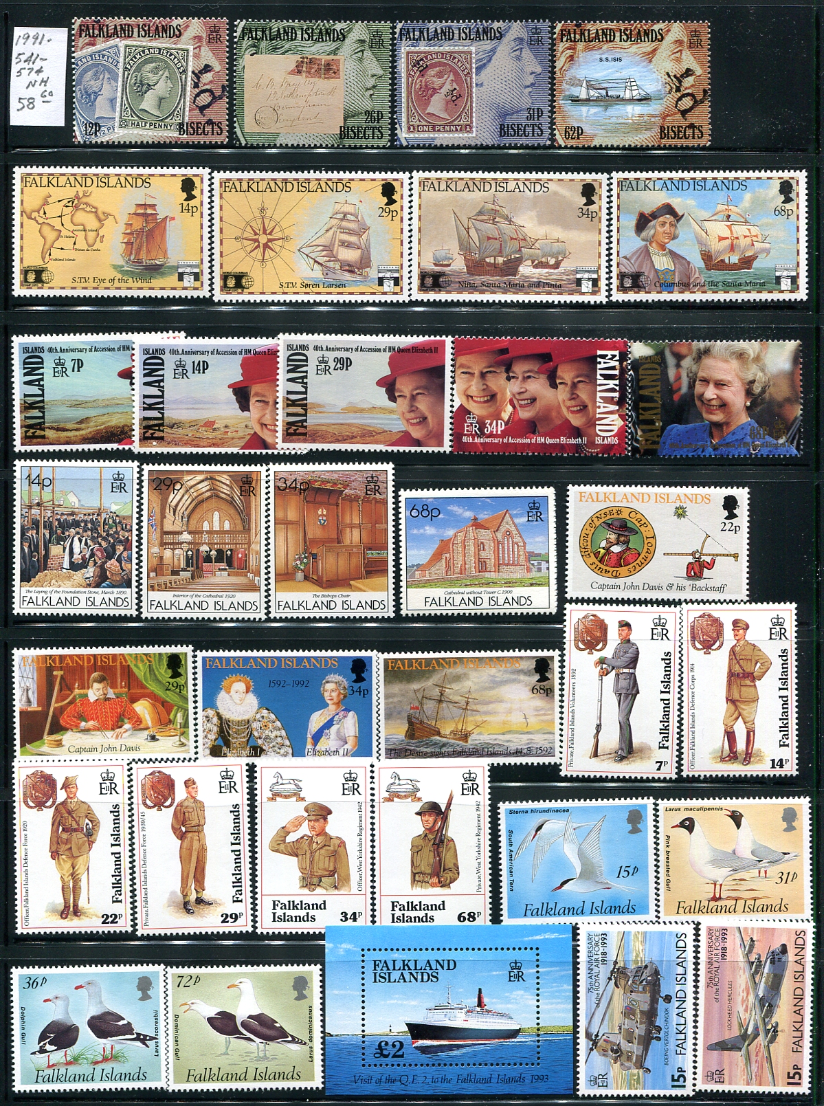 Marvelous mint collection of Falkland Islands, from 1935-1994 with 503 different stamps (including 9 souvenir sheets). A lovely run of singles and sets, largely complete for the period, all laid out and identified on 6 double-sided stockpages. Generally Lightly Hinged up to 1955, then Never Hinged thereafter. 2026 Scott US$1235.15 =