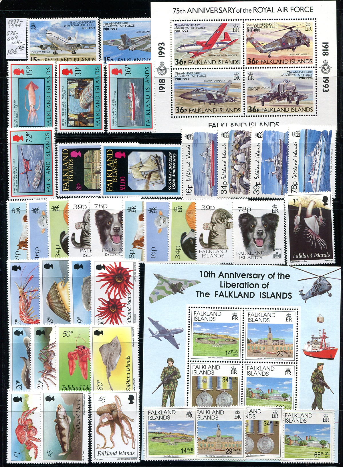 Marvelous mint collection of Falkland Islands, from 1935-1994 with 503 different stamps (including 9 souvenir sheets). A lovely run of singles and sets, largely complete for the period, all laid out and identified on 6 double-sided stockpages. Generally Lightly Hinged up to 1955, then Never Hinged thereafter. 2026 Scott US$1235.15 =