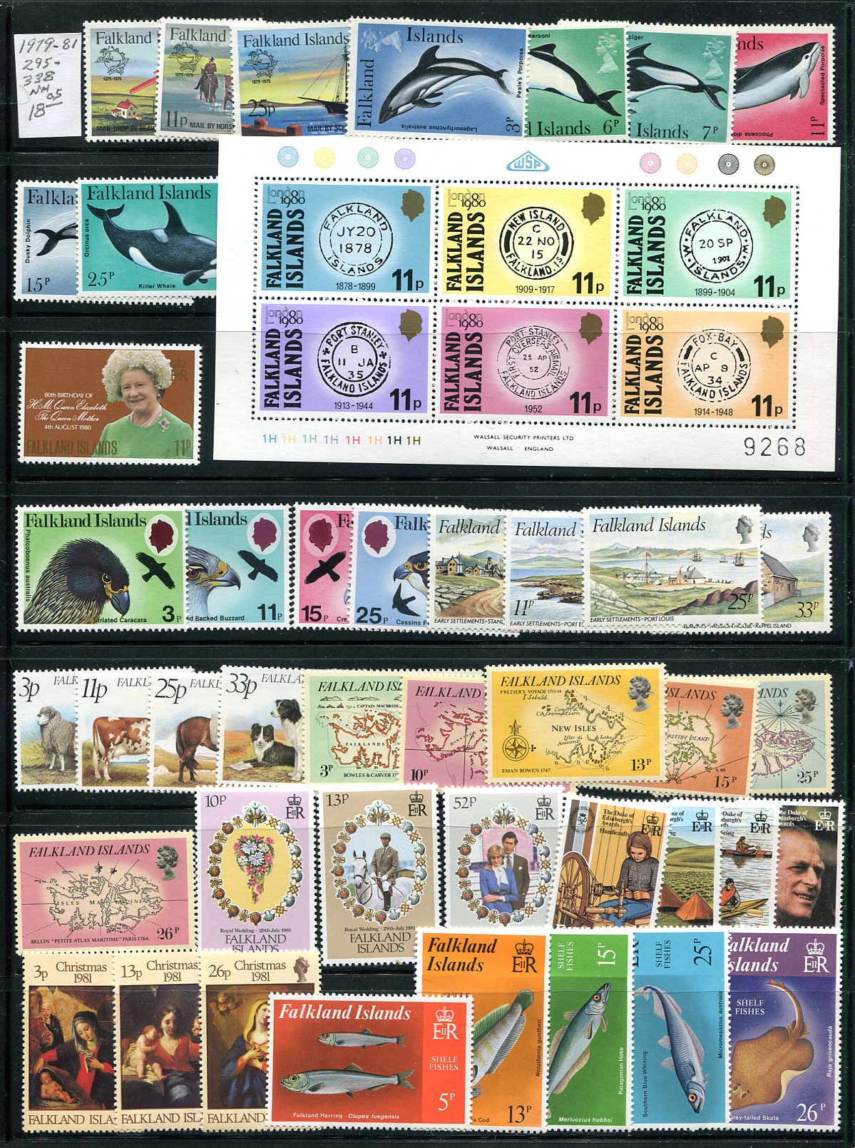 Marvelous mint collection of Falkland Islands, from 1935-1994 with 503 different stamps (including 9 souvenir sheets). A lovely run of singles and sets, largely complete for the period, all laid out and identified on 6 double-sided stockpages. Generally Lightly Hinged up to 1955, then Never Hinged thereafter. 2026 Scott US$1235.15 =