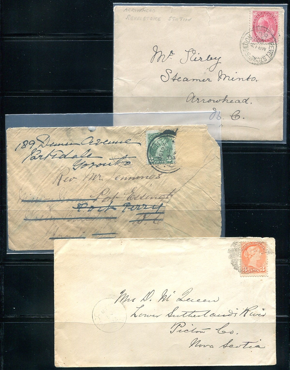 British Columbia Postal History. An intriguing half-dozen Queen Victoria era items as found from a local estate. Includes Victoria 1875 (Brit Col) Small Queen cover, Victoria 1890 Postmaster cover to Plumper Pass (backstamped), Nicola Lake 1892 CDS cover to NS, Vancouver 1888 Small Queen cover to UK, Skeena 1893 split ring received on (faulty) cover from Toronto and a Revelstoke Station 1900 CDS cover to "Mr Kirby, Steamer Minto, Arrowhead BC" (backstamped Arrowhead). A lovely group from a highly sought-after era. Estimate =
