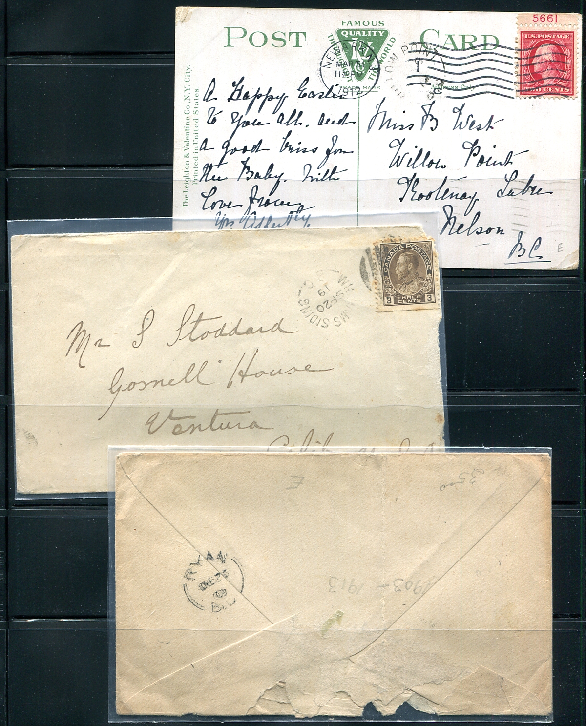 British Columbia Postal History. A high-powered trio of better Kootenay area Post Office split ring cancels on covers / postcard. Included is Williams Siding 1919 split ring on cover, Willow Point 1912 split ring on postcard and Ryan 1909 split ring (receiver) on cover from Carman MB. A nice group of tougher to find BC Post Office cancels. Estimate =