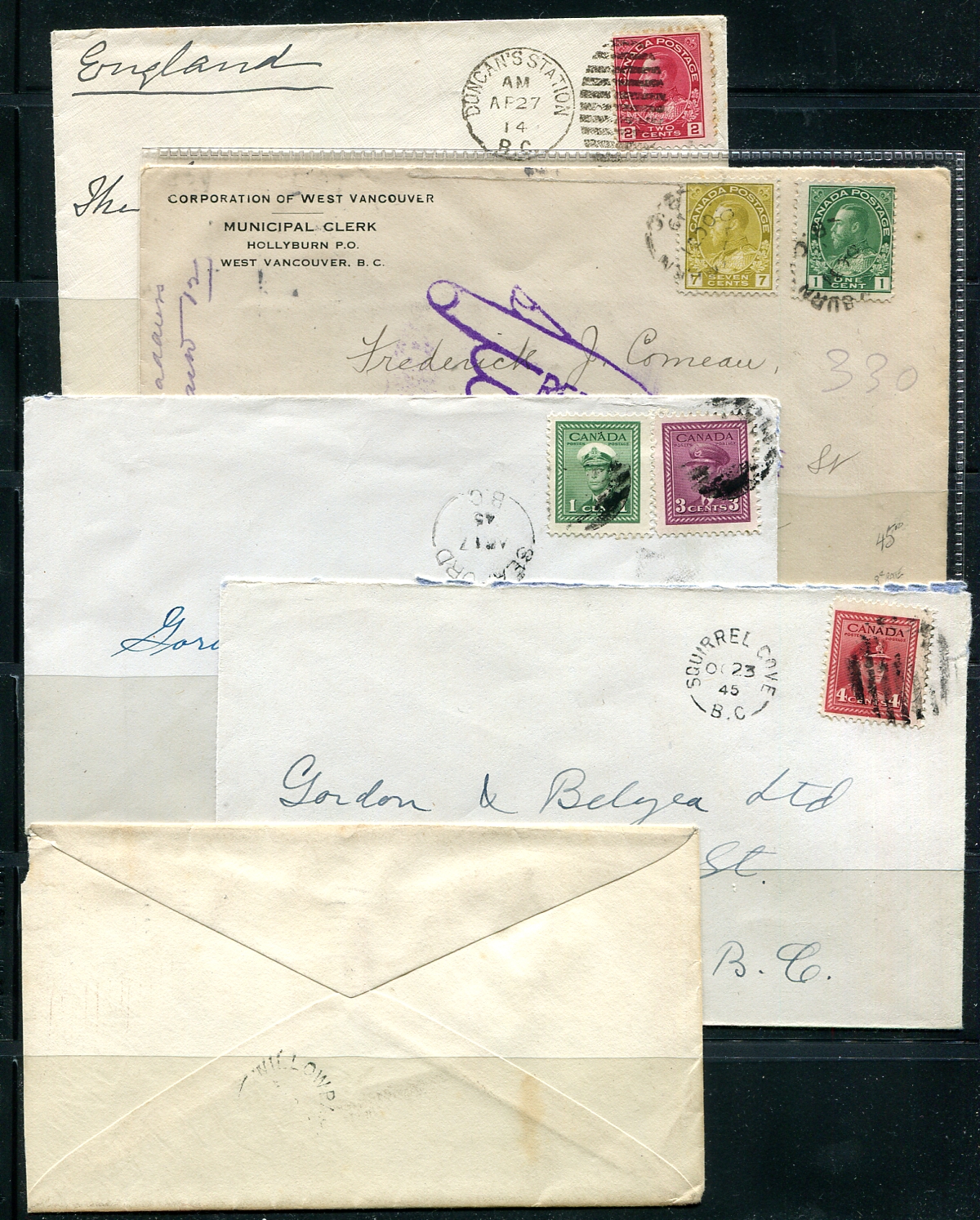 British Columbia Postal History. A diverse 10-pack of BC postmarks on cover / postcard, including several tough to find postmarks. Lot includes Shelley 1926 split ring cover to Sweden, Shaughnessy Heights 1912 split ring receiver, South Port Mann 1922 split ring receiver, Willow Park 1914 split ring receiver, Ducan's Station 1914 duplex cover, Cedar Cottage 1912 CDS postcard, Hollyburn 1919 split ring registered, Seaford 1945 split ring cover, Squirrel Cove 1945 split ring cover and Nelson Forks 1938 CDS cover. Sure to knock a town or two off the list of any BC postmark enthusiast. Estimate =