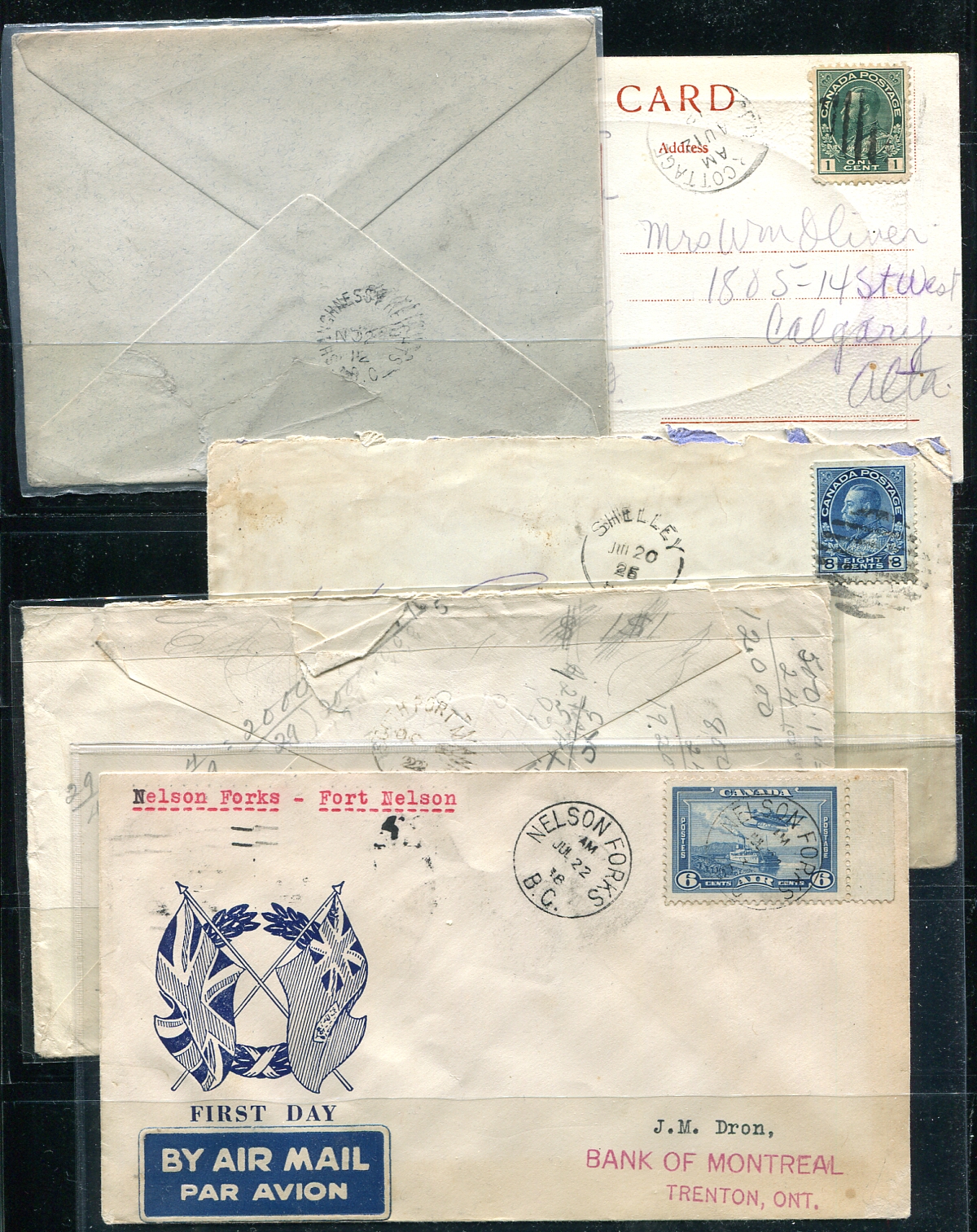 British Columbia Postal History. A diverse 10-pack of BC postmarks on cover / postcard, including several tough to find postmarks. Lot includes Shelley 1926 split ring cover to Sweden, Shaughnessy Heights 1912 split ring receiver, South Port Mann 1922 split ring receiver, Willow Park 1914 split ring receiver, Ducan's Station 1914 duplex cover, Cedar Cottage 1912 CDS postcard, Hollyburn 1919 split ring registered, Seaford 1945 split ring cover, Squirrel Cove 1945 split ring cover and Nelson Forks 1938 CDS cover. Sure to knock a town or two off the list of any BC postmark enthusiast. Estimate =