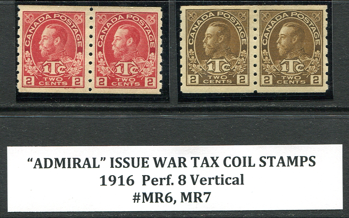 Very Fine mint Lighty Hinged pairs if the 1916 issue 2c+1c GeoV War Tax coil, consisting of the carmine Die I and brown Die II types. 2024 Unitrade is $540.00 for the VF LH duo. 2024 Scott US$400.00 =