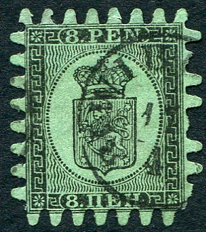 The 1867 issue 8 pennia black on green, serpentne roulette Type III. VF used, with tidy CDS cancel. 2025 Scott US$160.00 =
