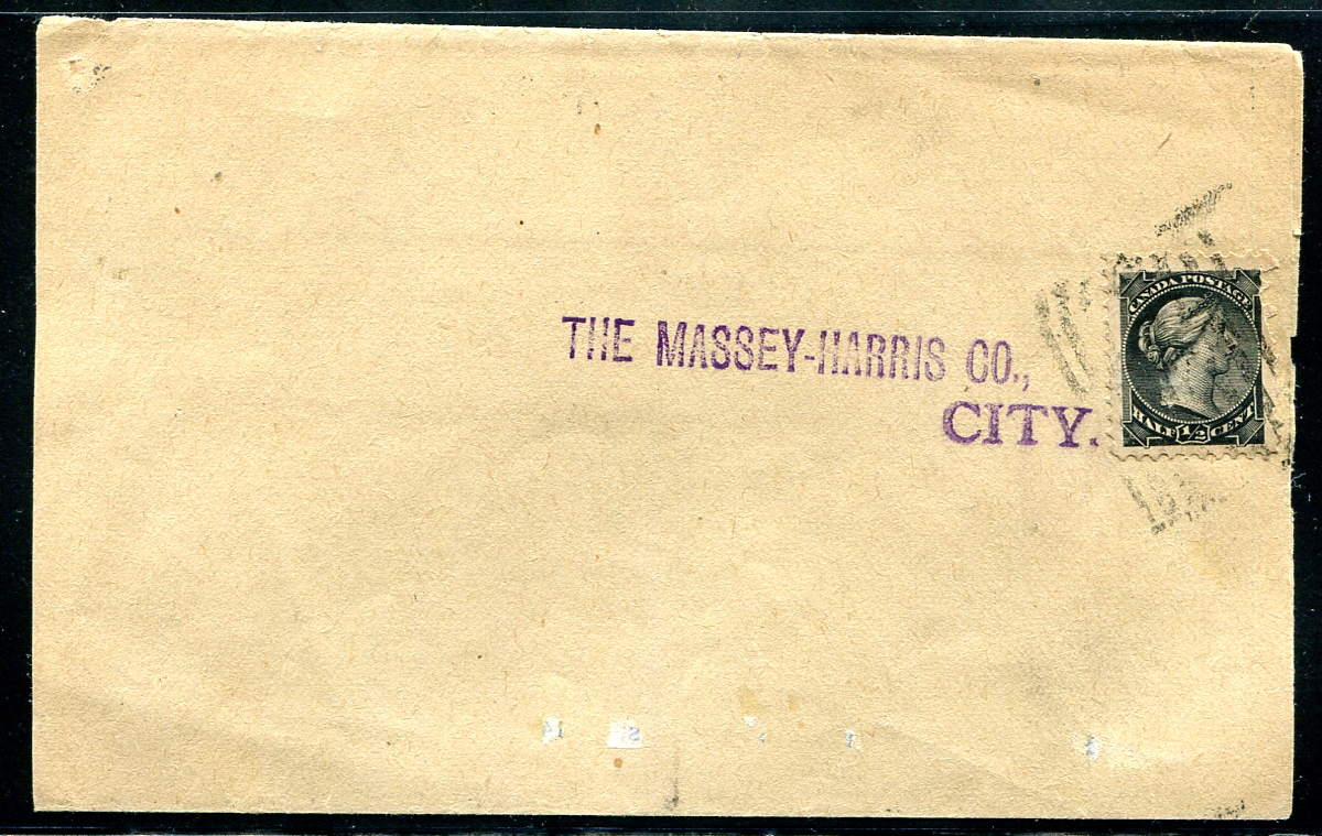 Attractive single-franking example of the 1/2c black Small Queen on circular / printed rate wrapper posted from (likely) Toronto to the Massey-Harris Company. An attractive addition to any postal history collection, or "plus-value" add-on to a traditional stamp collection. 2024 Unitrade =