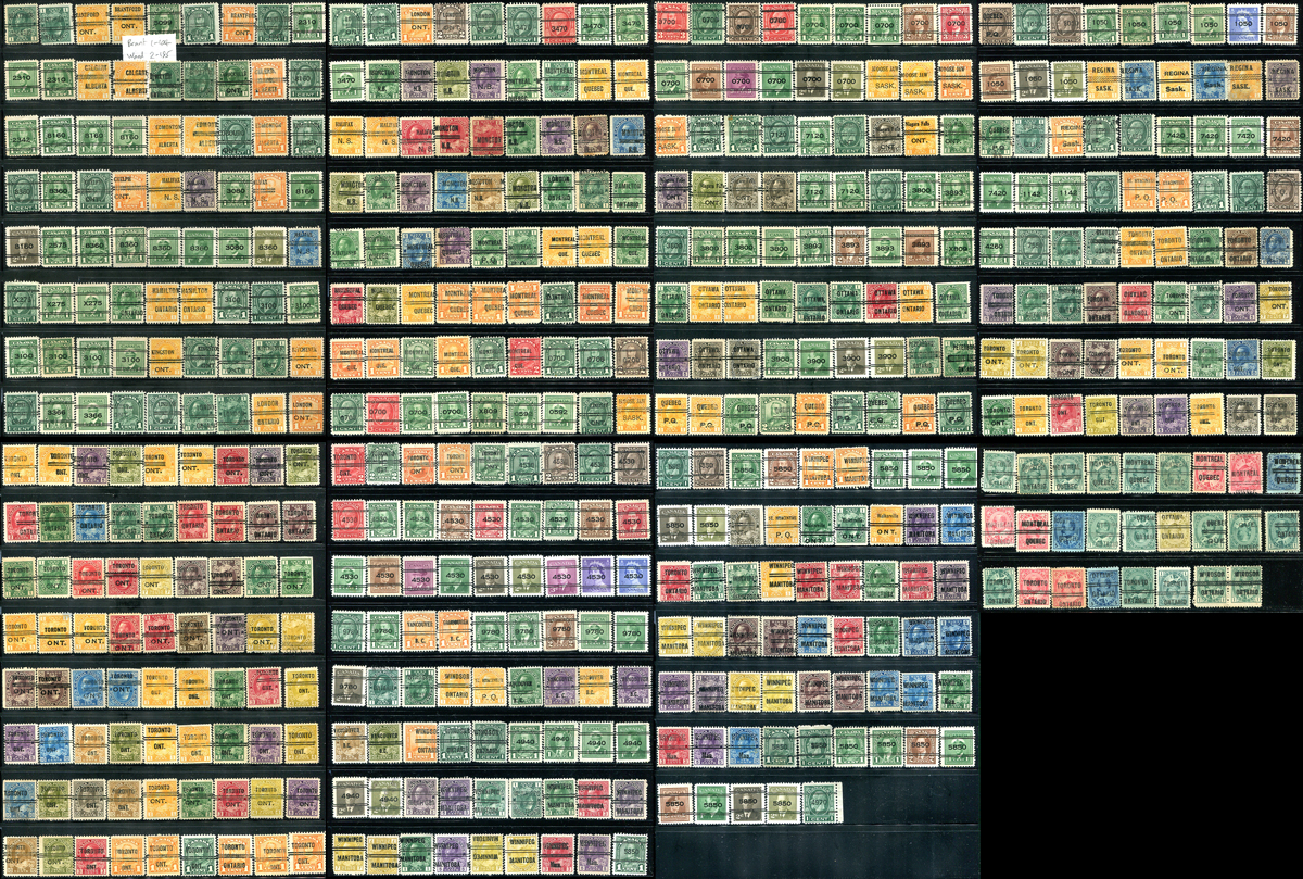 Assembly of 486 town precancels, from "Brockville to Winnipeg", including inverts, types/dies, colour shades etc. Expect the odd small fault, but overall very clean with strength in the Admiral era. All neatly arranged on four double-side Vario brand stocksheets. Owner’s precancel catalogue value =