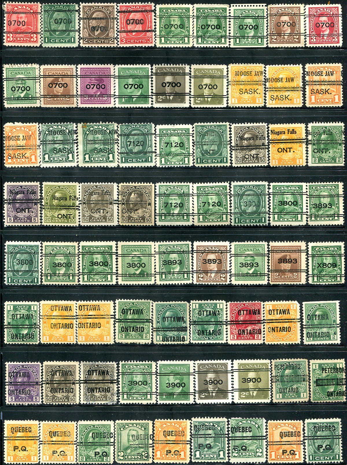 Assembly of 486 town precancels, from "Brockville to Winnipeg", including inverts, types/dies, colour shades etc. Expect the odd small fault, but overall very clean with strength in the Admiral era. All neatly arranged on four double-side Vario brand stocksheets. Owner’s precancel catalogue value =