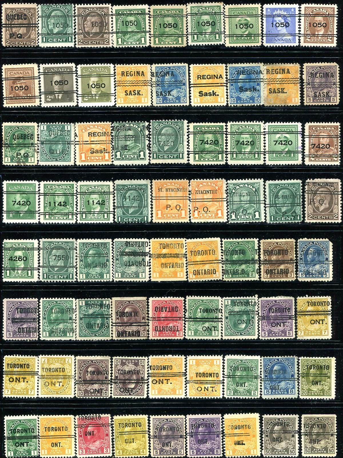 Assembly of 486 town precancels, from "Brockville to Winnipeg", including inverts, types/dies, colour shades etc. Expect the odd small fault, but overall very clean with strength in the Admiral era. All neatly arranged on four double-side Vario brand stocksheets. Owner’s precancel catalogue value =