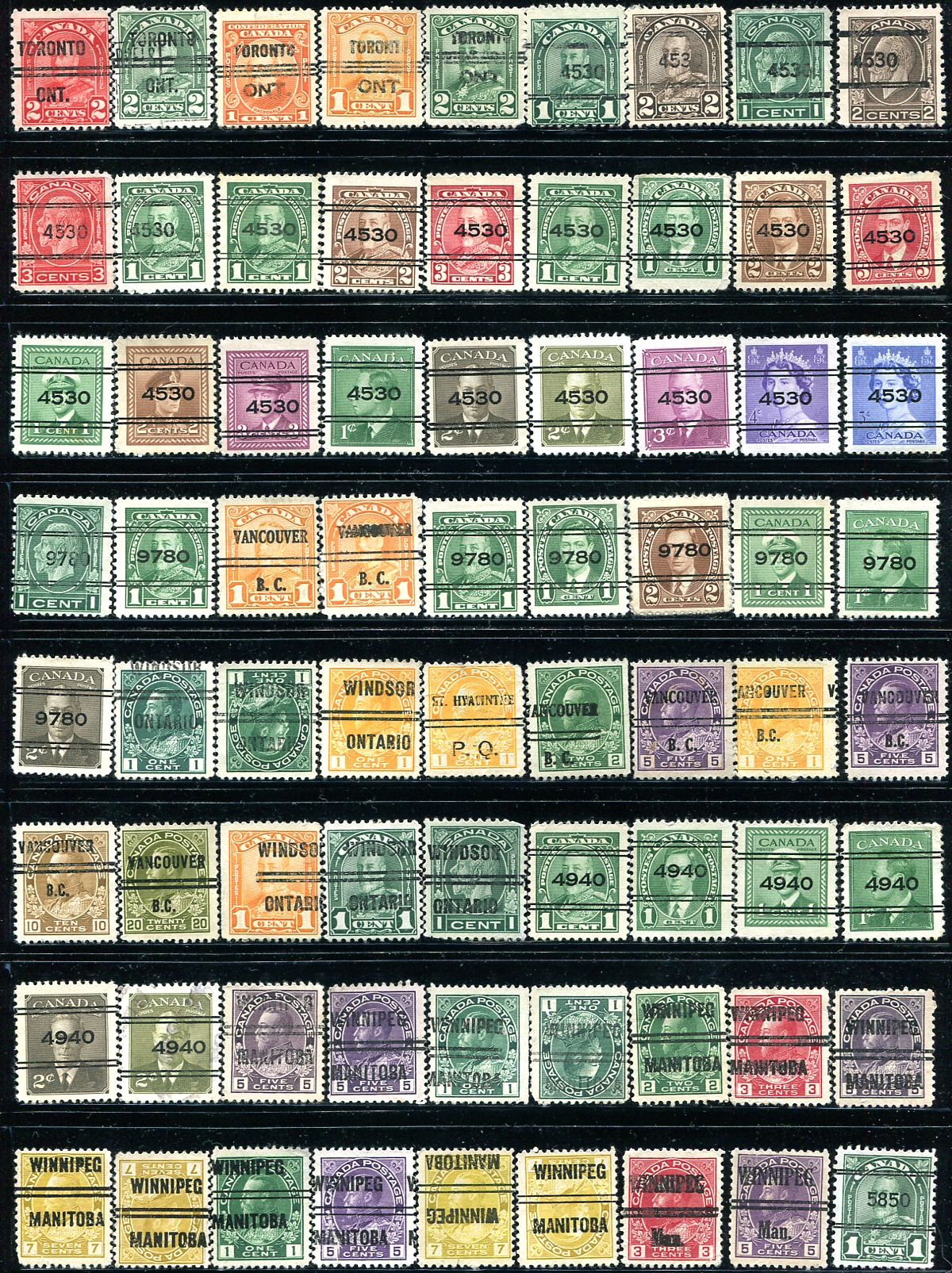 Assembly of 486 town precancels, from "Brockville to Winnipeg", including inverts, types/dies, colour shades etc. Expect the odd small fault, but overall very clean with strength in the Admiral era. All neatly arranged on four double-side Vario brand stocksheets. Owner’s precancel catalogue value =