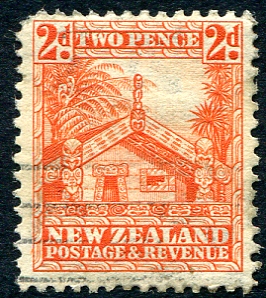 Fine used example of the seldom-seen 1936-1942 "Maori Council House" 2p red orange, with inverted watermark. Not listed in Scott, but listed in Stanley Gibbons as #580aw. Slightly nibbled perf UL corner, but a nice example of this sought-after variety. Gibbons catalogue £325.00 ($611.25 CDN). Estimate =