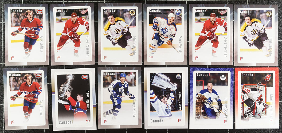 Mint "Hockey Night in Canada" Holding. A collector's slightly duplicated holding of 48x high value $1.80 / $2.50 self-adhesive "Hockey Card" series, with each stamp designed to look like a hockey card, with information about the player on the reverse. A novel idea by Canada Post and one of the most popular issues of the 21st century, with interest that goes beyond the usual "stamp collector" to include sports card collectors and hockey enthusiasts! The face value alone is $94.80. Estimate =