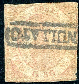 VG used example of the 1858 issued 50gr rose lake "Coat of Arms" with boxed "ANULLATO" postmark. Usual somewhat washed out appearance on this early imperforate issue. 2025 Scott US$2400.00 =