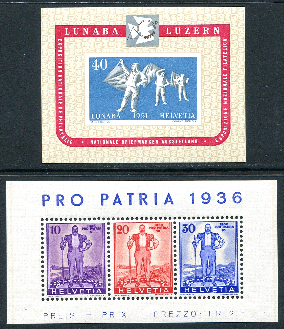 VF mint Never Hinged duo of better semi-postal souvenir sheets including the 1936 "Alpine Herdsman" and 1951 "LUNABA" issues. Post Office fresh and with pristine gum. 2025 Scott US$380.00 =