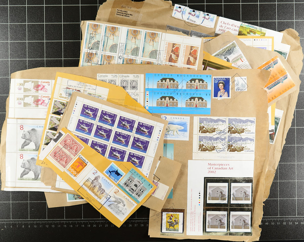 Accumulation of multiple thousands of worldwide stamps in a variety of formats, with on and off paper material in albums, glassines, 102 cards, plastic bags, small boxes, etc. This is a bit of a mystery box and a quick check indicated better representation from Austria, Australia, Canada, New Zealand, Germany, and much more, with material ranging from the 1920's onwards. A bit of a hodgepodge of a lot, which would make a nice winter project for the worldwide collector. Estimate =
