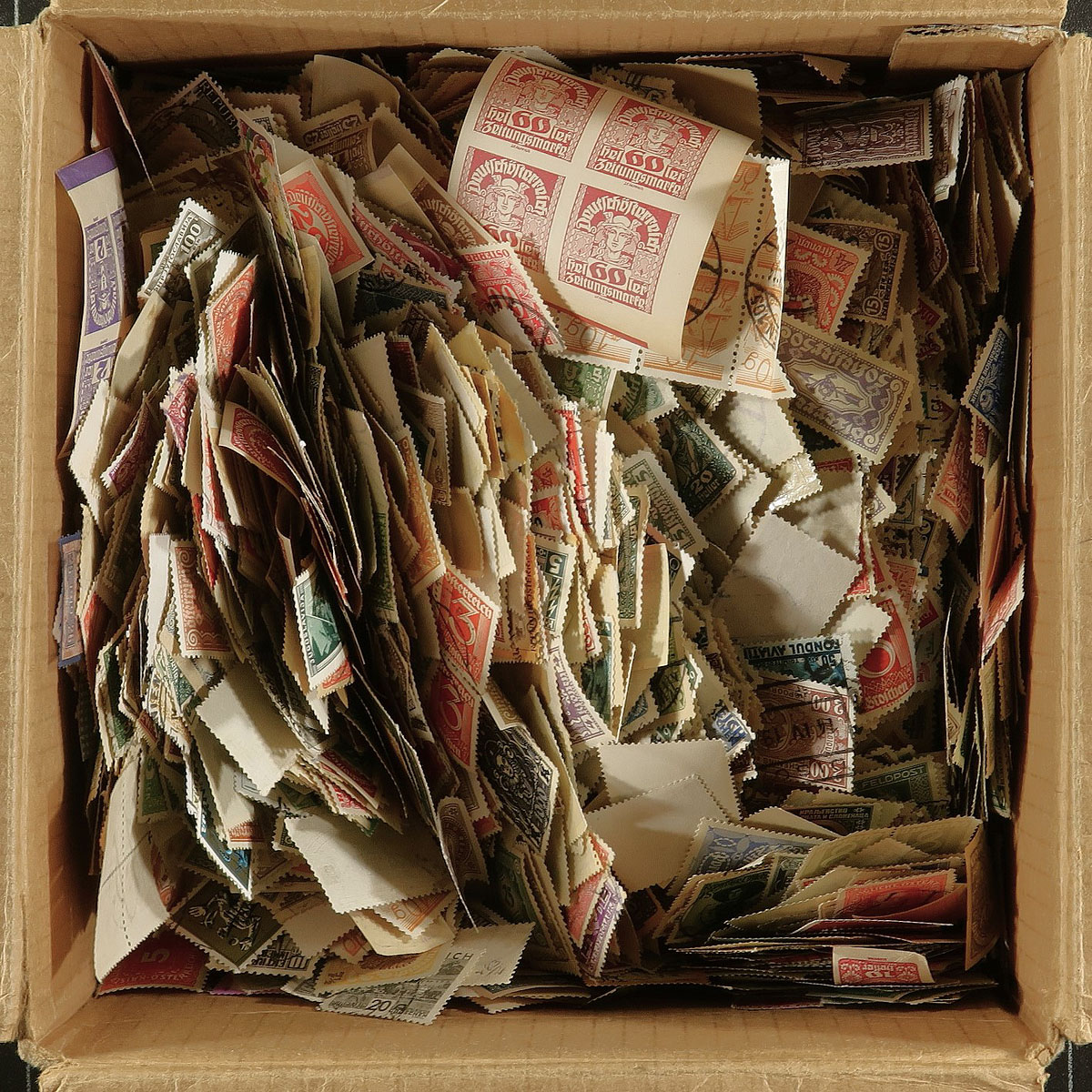 Accumulation of multiple thousands of worldwide stamps in a variety of formats, with on and off paper material in albums, glassines, 102 cards, plastic bags, small boxes, etc. This is a bit of a mystery box and a quick check indicated better representation from Austria, Australia, Canada, New Zealand, Germany, and much more, with material ranging from the 1920's onwards. A bit of a hodgepodge of a lot, which would make a nice winter project for the worldwide collector. Estimate =