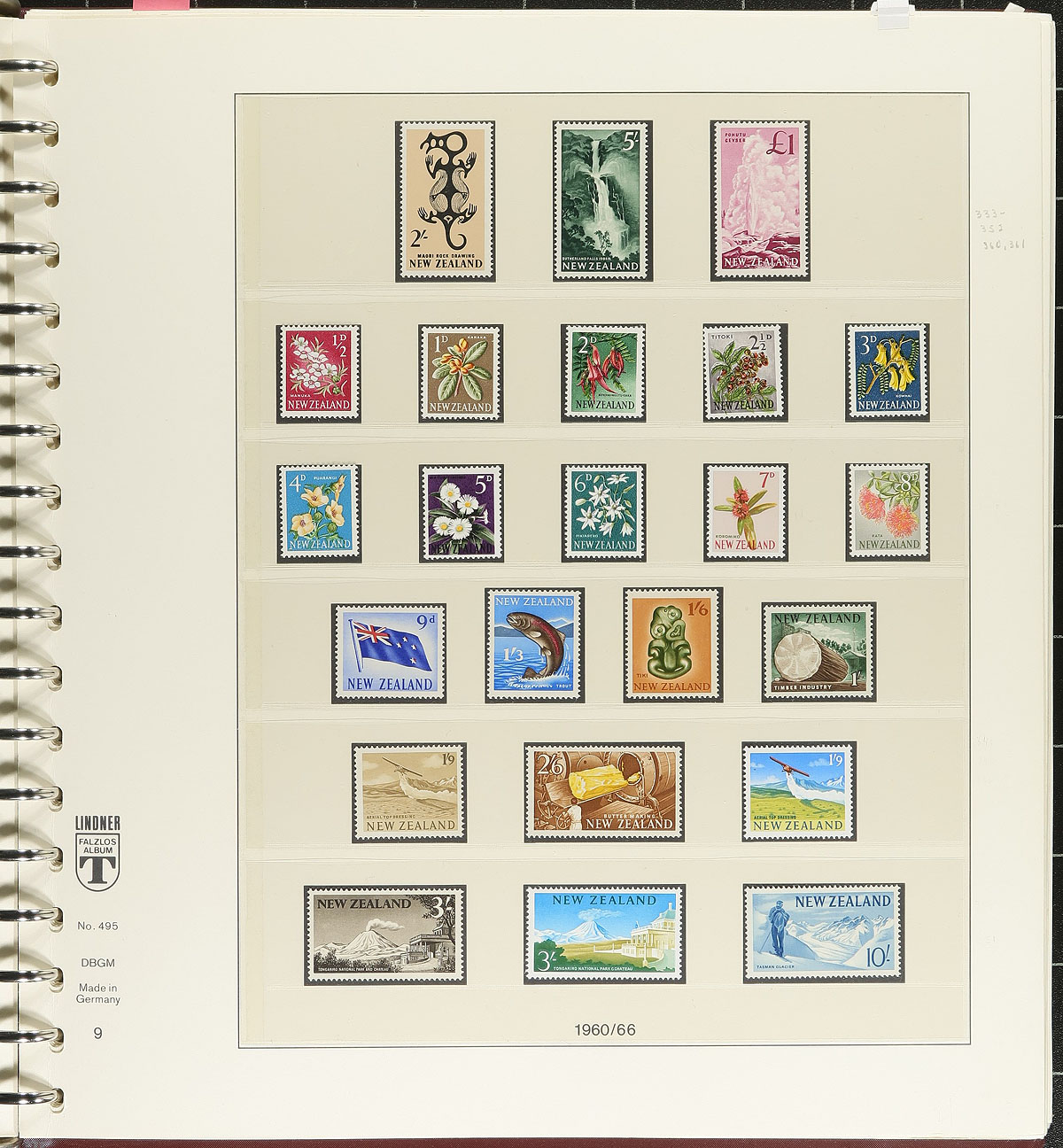 Nice grouping of primarily never hinged New Zealand, 1950's-1990's, containing roughly 750 stamps, including a Lindner album containing 500 stamps, ranging from Scott #280/650, noting better sets with #s 333-352 (c.v. $80 total), 382-404 ($76 total), AR102-AR105 ($48 total). The lot also includes stock pages of several semi-postal singles and miniature sheets (few cataloguing $20 and up), a handful of presentation packs from the 1980's, and a 1997 year set. Owner's 2009 Scott catalogue value for the lot totals US$832.00 (not including presentation packs or year set). A nice lot for all collectors. Estimate =
