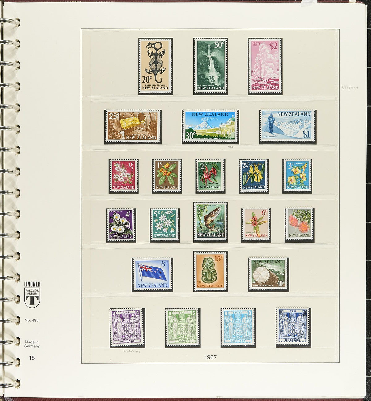 Nice grouping of primarily never hinged New Zealand, 1950's-1990's, containing roughly 750 stamps, including a Lindner album containing 500 stamps, ranging from Scott #280/650, noting better sets with #s 333-352 (c.v. $80 total), 382-404 ($76 total), AR102-AR105 ($48 total). The lot also includes stock pages of several semi-postal singles and miniature sheets (few cataloguing $20 and up), a handful of presentation packs from the 1980's, and a 1997 year set. Owner's 2009 Scott catalogue value for the lot totals US$832.00 (not including presentation packs or year set). A nice lot for all collectors. Estimate =