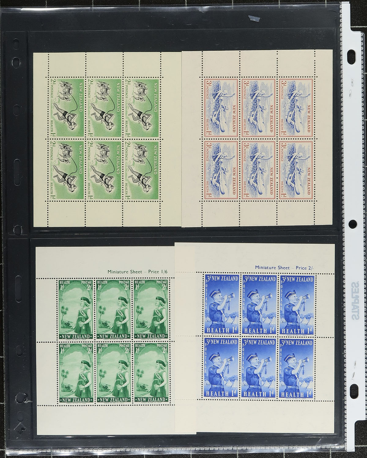Nice grouping of primarily never hinged New Zealand, 1950's-1990's, containing roughly 750 stamps, including a Lindner album containing 500 stamps, ranging from Scott #280/650, noting better sets with #s 333-352 (c.v. $80 total), 382-404 ($76 total), AR102-AR105 ($48 total). The lot also includes stock pages of several semi-postal singles and miniature sheets (few cataloguing $20 and up), a handful of presentation packs from the 1980's, and a 1997 year set. Owner's 2009 Scott catalogue value for the lot totals US$832.00 (not including presentation packs or year set). A nice lot for all collectors. Estimate =
