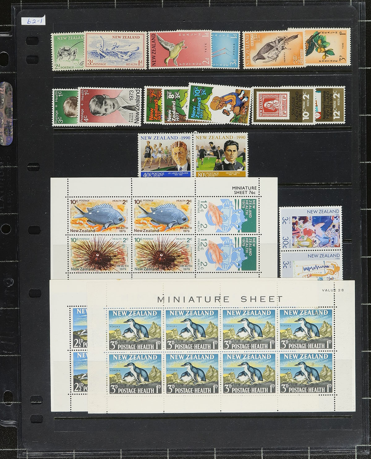 Nice grouping of primarily never hinged New Zealand, 1950's-1990's, containing roughly 750 stamps, including a Lindner album containing 500 stamps, ranging from Scott #280/650, noting better sets with #s 333-352 (c.v. $80 total), 382-404 ($76 total), AR102-AR105 ($48 total). The lot also includes stock pages of several semi-postal singles and miniature sheets (few cataloguing $20 and up), a handful of presentation packs from the 1980's, and a 1997 year set. Owner's 2009 Scott catalogue value for the lot totals US$832.00 (not including presentation packs or year set). A nice lot for all collectors. Estimate =