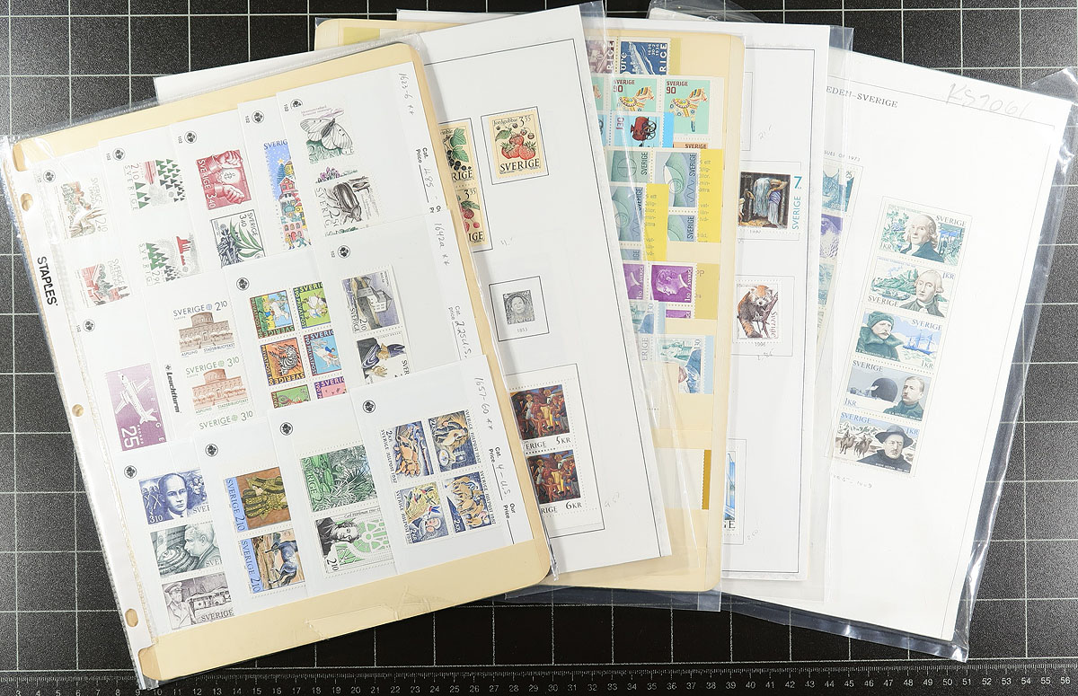 Group of mint Sweden, 1933-1997, containing over 500 stamps, mostly on album pages and in a handful of stock pages. The lot generally ranges from Scott #236/2253, noting mostly sets, booklets, and booklet panes, noting a few items in the $5 to $10 range. We note mint hinged items on the album pages and primarily never hinged in the stock pages. A nice clean lot for collectors. Owner's older 2019 Scott US$882.00 =