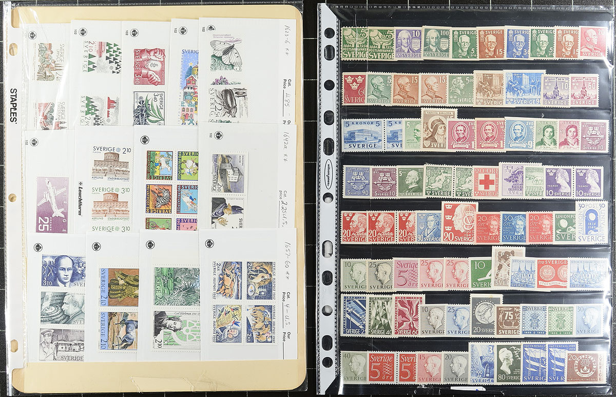 Group of mint Sweden, 1933-1997, containing over 500 stamps, mostly on album pages and in a handful of stock pages. The lot generally ranges from Scott #236/2253, noting mostly sets, booklets, and booklet panes, noting a few items in the $5 to $10 range. We note mint hinged items on the album pages and primarily never hinged in the stock pages. A nice clean lot for collectors. Owner's older 2019 Scott US$882.00 =