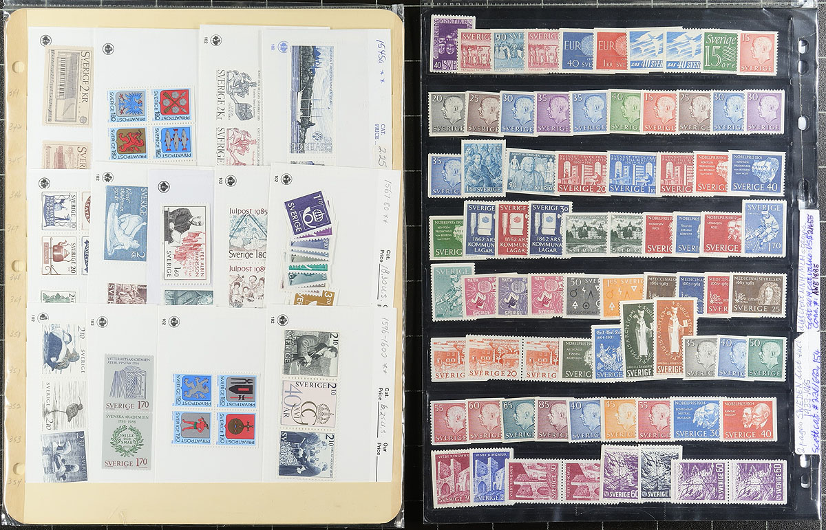 Group of mint Sweden, 1933-1997, containing over 500 stamps, mostly on album pages and in a handful of stock pages. The lot generally ranges from Scott #236/2253, noting mostly sets, booklets, and booklet panes, noting a few items in the $5 to $10 range. We note mint hinged items on the album pages and primarily never hinged in the stock pages. A nice clean lot for collectors. Owner's older 2019 Scott US$882.00 =
