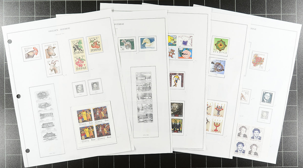 Group of mint Sweden, 1933-1997, containing over 500 stamps, mostly on album pages and in a handful of stock pages. The lot generally ranges from Scott #236/2253, noting mostly sets, booklets, and booklet panes, noting a few items in the $5 to $10 range. We note mint hinged items on the album pages and primarily never hinged in the stock pages. A nice clean lot for collectors. Owner's older 2019 Scott US$882.00 =