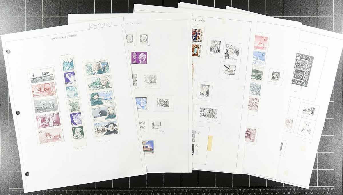 Group of mint Sweden, 1933-1997, containing over 500 stamps, mostly on album pages and in a handful of stock pages. The lot generally ranges from Scott #236/2253, noting mostly sets, booklets, and booklet panes, noting a few items in the $5 to $10 range. We note mint hinged items on the album pages and primarily never hinged in the stock pages. A nice clean lot for collectors. Owner's older 2019 Scott US$882.00 =