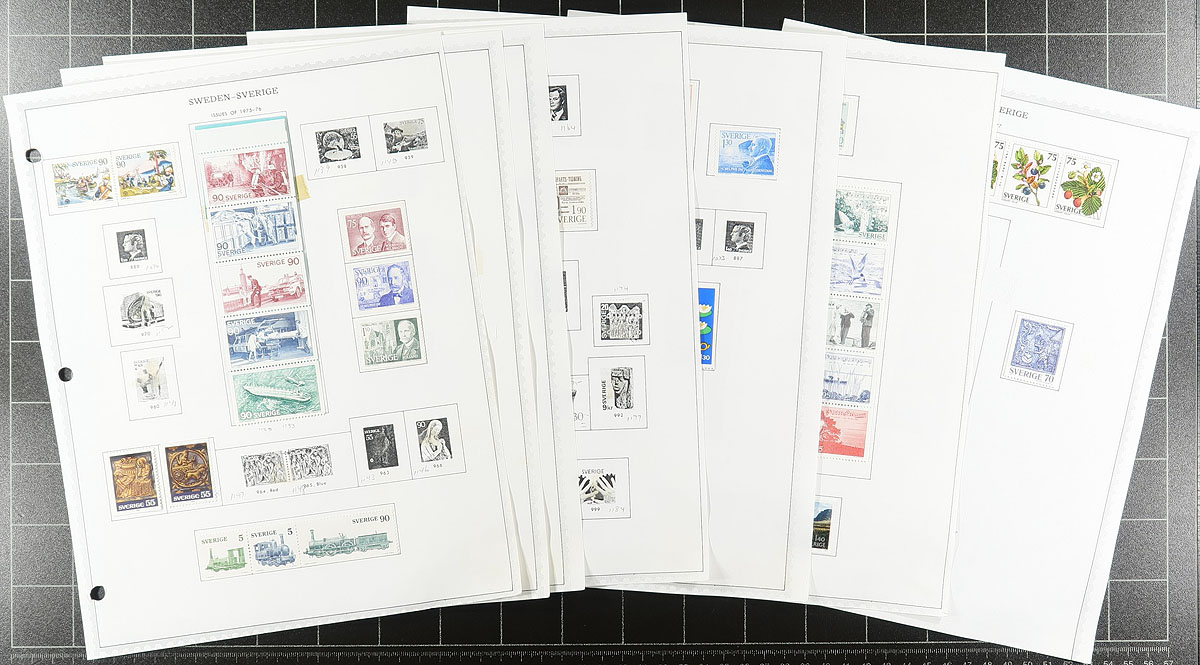 Group of mint Sweden, 1933-1997, containing over 500 stamps, mostly on album pages and in a handful of stock pages. The lot generally ranges from Scott #236/2253, noting mostly sets, booklets, and booklet panes, noting a few items in the $5 to $10 range. We note mint hinged items on the album pages and primarily never hinged in the stock pages. A nice clean lot for collectors. Owner's older 2019 Scott US$882.00 =