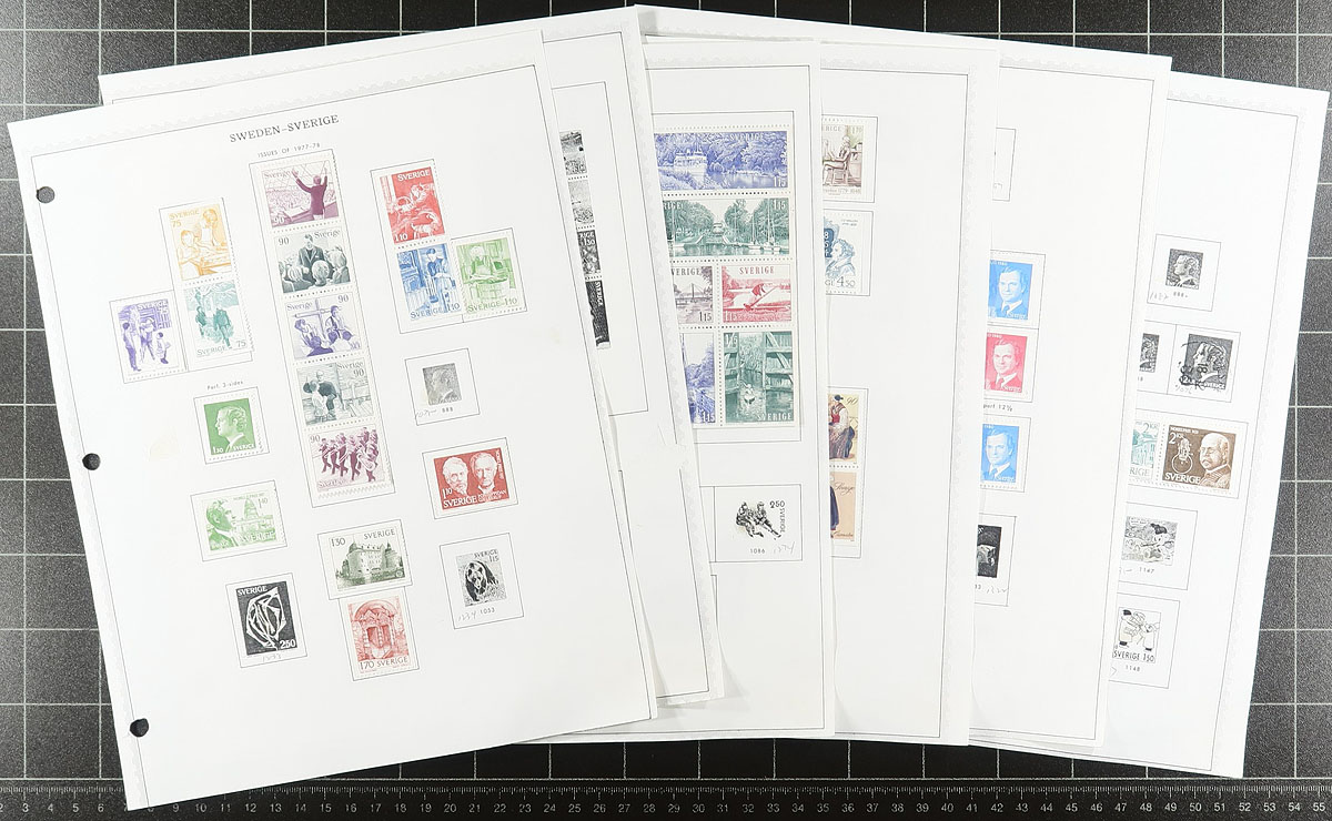 Group of mint Sweden, 1933-1997, containing over 500 stamps, mostly on album pages and in a handful of stock pages. The lot generally ranges from Scott #236/2253, noting mostly sets, booklets, and booklet panes, noting a few items in the $5 to $10 range. We note mint hinged items on the album pages and primarily never hinged in the stock pages. A nice clean lot for collectors. Owner's older 2019 Scott US$882.00 =