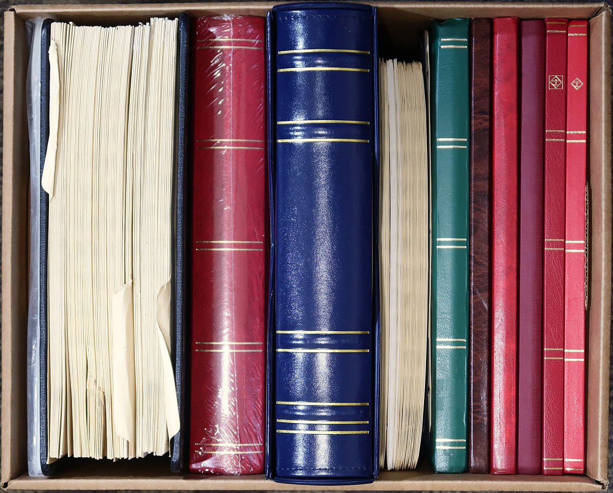 Bankers box full of used to like new items for the stamp collector. Includes 7 stockbooks of various sizes (one brand new still wrapped in original packaging), a Lighthouse binder with roughly 65x divided Vario-style stock pages (roughly 5" x 3 3/4" sized), and roughly 100 manila stock pages (some loose, with the majority in an old style album, pen notations per row on each page). A still useful lot for all collectors. Estimate =