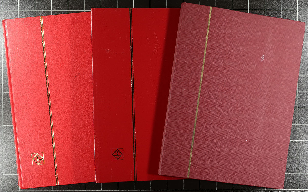Bankers box full of used to like new items for the stamp collector. Includes 7 stockbooks of various sizes (one brand new still wrapped in original packaging), a Lighthouse binder with roughly 65x divided Vario-style stock pages (roughly 5" x 3 3/4" sized), and roughly 100 manila stock pages (some loose, with the majority in an old style album, pen notations per row on each page). A still useful lot for all collectors. Estimate =