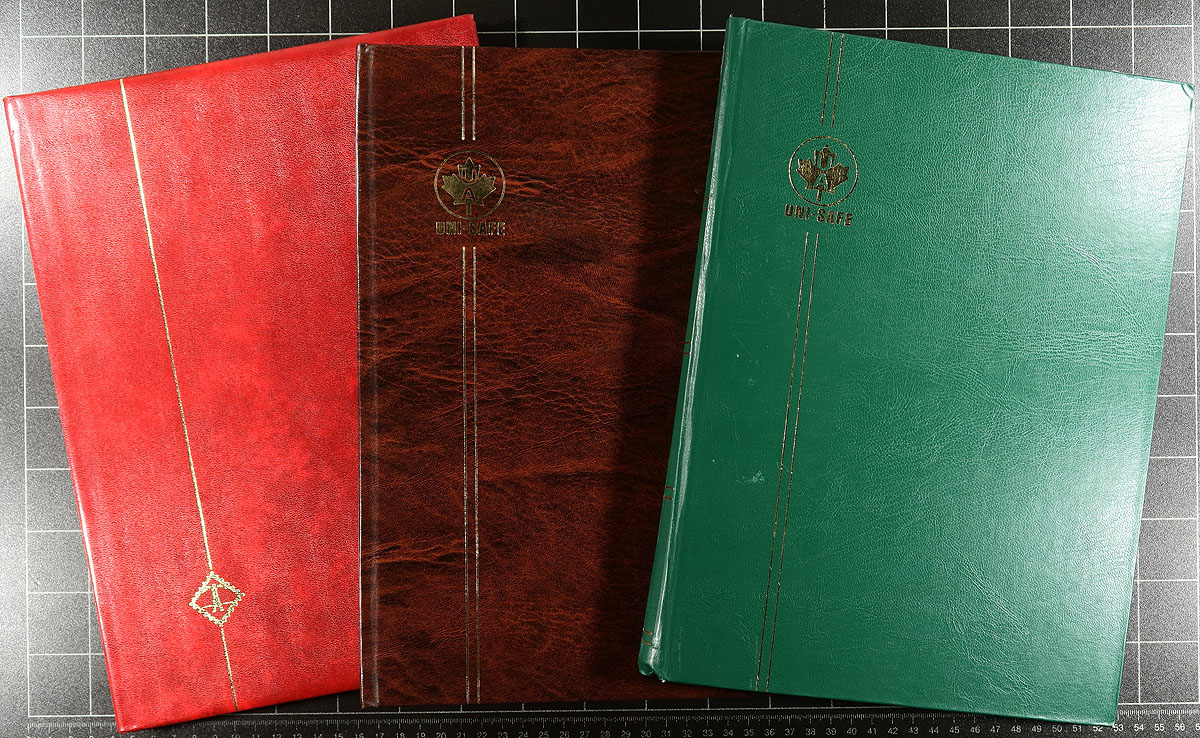Bankers box full of used to like new items for the stamp collector. Includes 7 stockbooks of various sizes (one brand new still wrapped in original packaging), a Lighthouse binder with roughly 65x divided Vario-style stock pages (roughly 5" x 3 3/4" sized), and roughly 100 manila stock pages (some loose, with the majority in an old style album, pen notations per row on each page). A still useful lot for all collectors. Estimate =