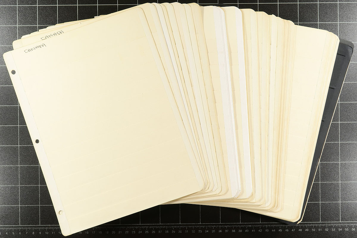 Bankers box full of used to like new items for the stamp collector. Includes 7 stockbooks of various sizes (one brand new still wrapped in original packaging), a Lighthouse binder with roughly 65x divided Vario-style stock pages (roughly 5" x 3 3/4" sized), and roughly 100 manila stock pages (some loose, with the majority in an old style album, pen notations per row on each page). A still useful lot for all collectors. Estimate =