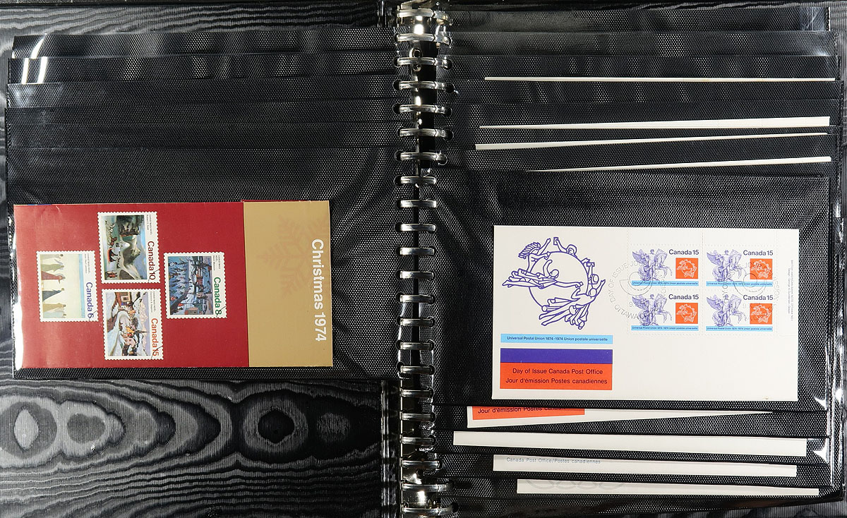 First Day Covers. Collection of 240 Canada first day covers, 1960's-1980, in 10 cover albums, almost all collected for upper right plate block frankings. Each album contains roughly 24 first day covers, with the vast majority also having the Canada Post Office Announcement. One album contains 24 private cachet covers from the 1960's with mostly single issue frankings. A very clean collection, ideal for the plate block and cover collector. Estimate =