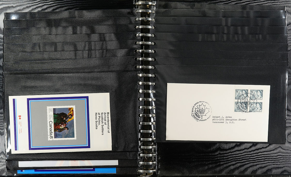 First Day Covers. Collection of 240 Canada first day covers, 1960's-1980, in 10 cover albums, almost all collected for upper right plate block frankings. Each album contains roughly 24 first day covers, with the vast majority also having the Canada Post Office Announcement. One album contains 24 private cachet covers from the 1960's with mostly single issue frankings. A very clean collection, ideal for the plate block and cover collector. Estimate =