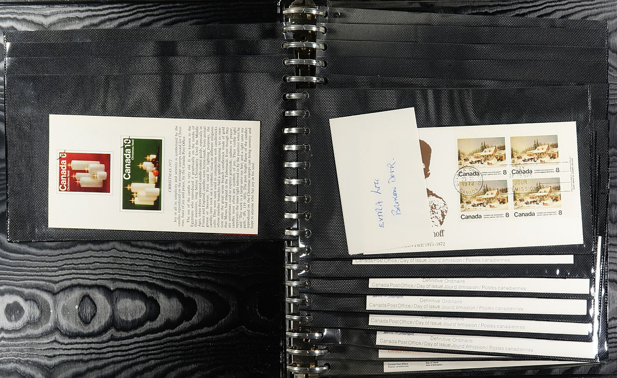 First Day Covers. Collection of 240 Canada first day covers, 1960's-1980, in 10 cover albums, almost all collected for upper right plate block frankings. Each album contains roughly 24 first day covers, with the vast majority also having the Canada Post Office Announcement. One album contains 24 private cachet covers from the 1960's with mostly single issue frankings. A very clean collection, ideal for the plate block and cover collector. Estimate =