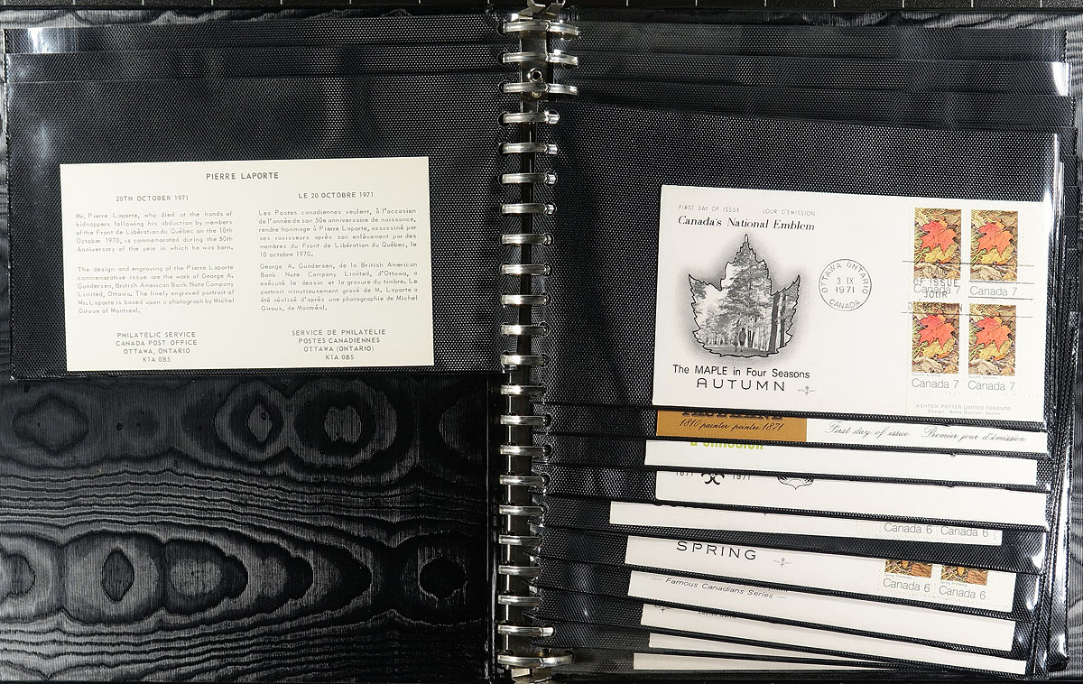 First Day Covers. Collection of 240 Canada first day covers, 1960's-1980, in 10 cover albums, almost all collected for upper right plate block frankings. Each album contains roughly 24 first day covers, with the vast majority also having the Canada Post Office Announcement. One album contains 24 private cachet covers from the 1960's with mostly single issue frankings. A very clean collection, ideal for the plate block and cover collector. Estimate =