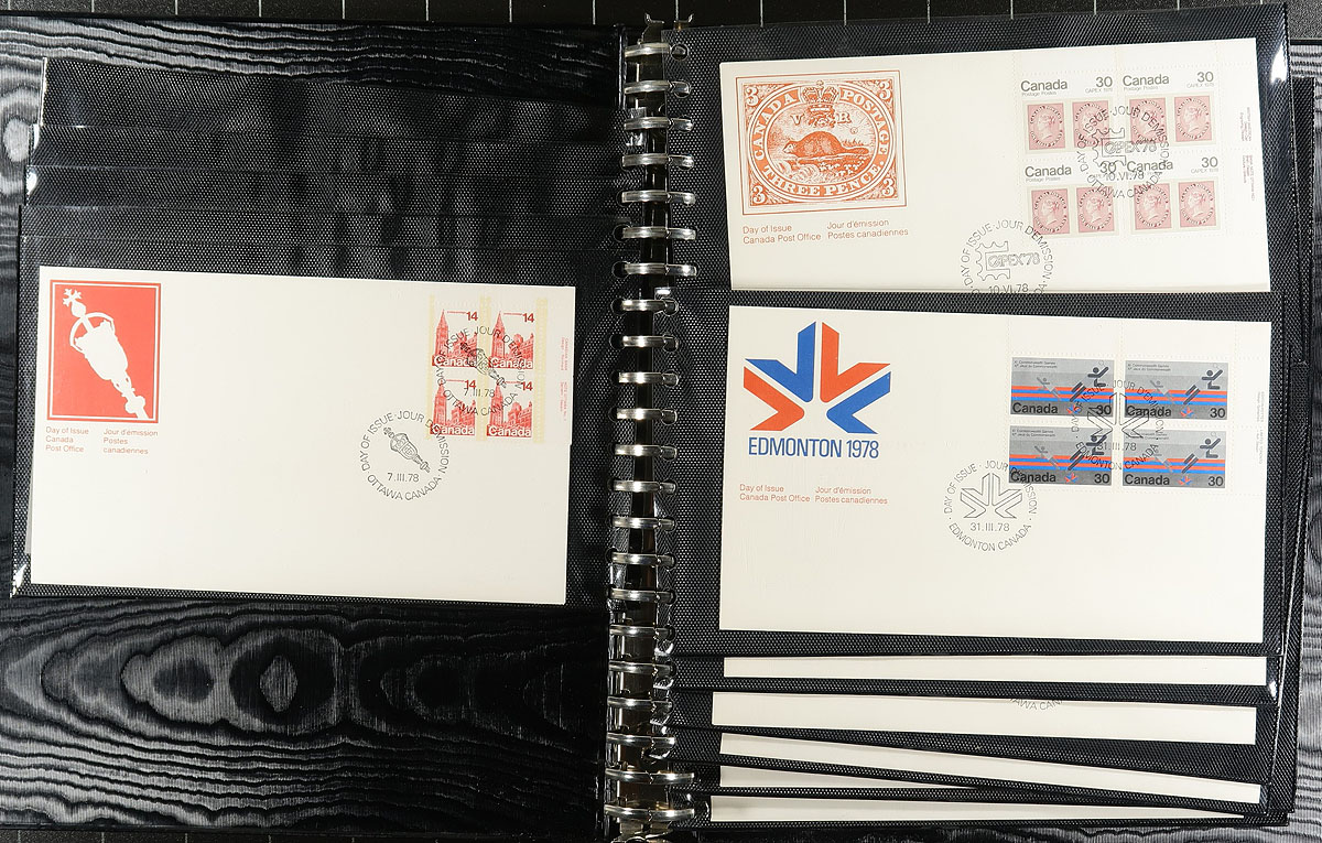 First Day Covers. Collection of 240 Canada first day covers, 1960's-1980, in 10 cover albums, almost all collected for upper right plate block frankings. Each album contains roughly 24 first day covers, with the vast majority also having the Canada Post Office Announcement. One album contains 24 private cachet covers from the 1960's with mostly single issue frankings. A very clean collection, ideal for the plate block and cover collector. Estimate =