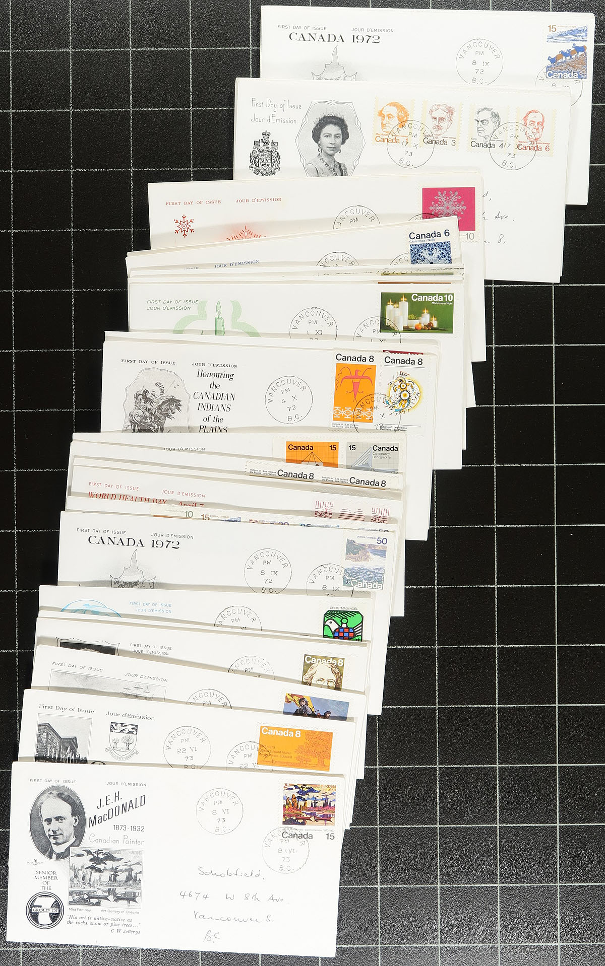 First Day Covers. Nice group of roughly 170 Canada private cachet first day covers, all with Vancouver, BC postmarks, generally ranging from the 1950's to 1973. We note single and sets frankings, the majority having Rosecraft cachets, along with FT, Capital City, Cole, and a few others. Post offices are mostly Vancouver cds cancels, including a few sub offices and stations, along with slogans and more. A nice lot for the first day, or British Columbia postmark collector. Estimate =