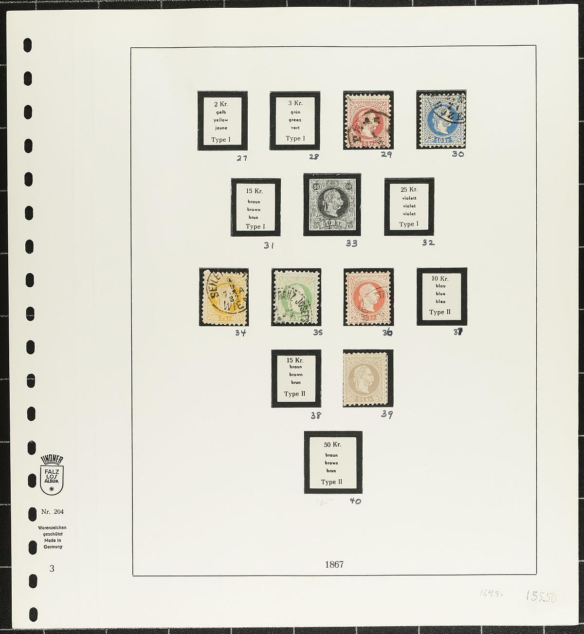 Collection of mint and used Austria, 1860-1937, with roughly 350 stamps neatly organized in hingeless Lindner album pages. The collection ranges from Scott #14/389, noting singles and sets with some material cataloguing $10 and up. Owner's 2008 Scott catalogue value totals US$718.00. Postmark interest include cds types, double ring, fancy, and a few other cancel types, including a few "socked on the nose" town cancels. A nice lot that should be continued, a few small faults noted, overall fine to very fine. Estimate =