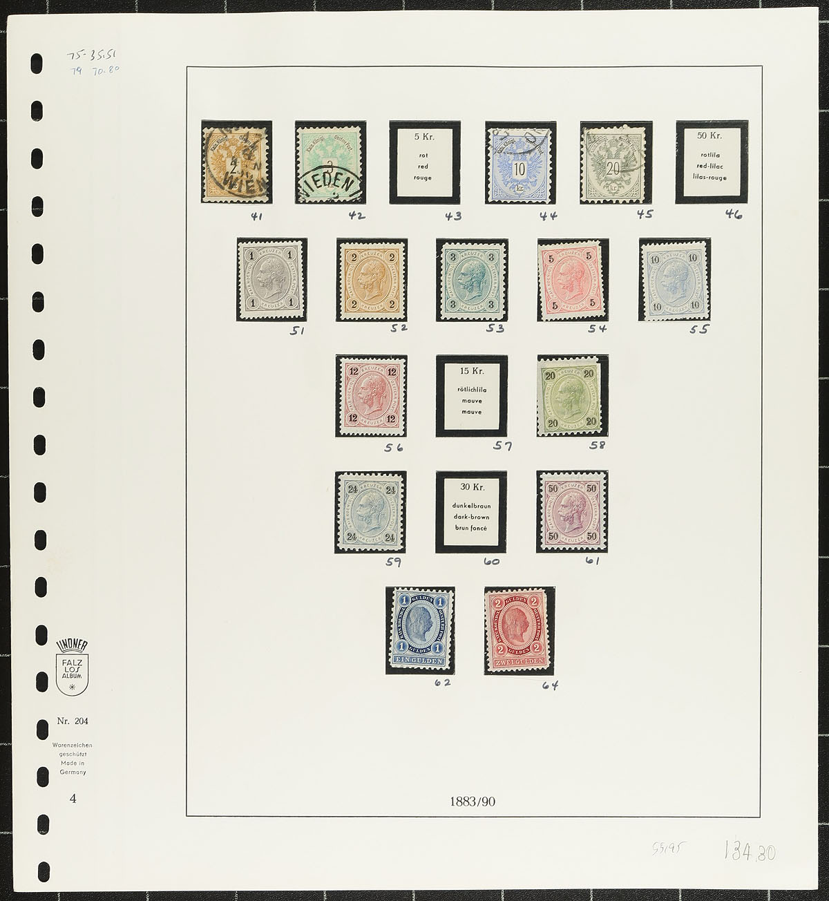 Collection of mint and used Austria, 1860-1937, with roughly 350 stamps neatly organized in hingeless Lindner album pages. The collection ranges from Scott #14/389, noting singles and sets with some material cataloguing $10 and up. Owner's 2008 Scott catalogue value totals US$718.00. Postmark interest include cds types, double ring, fancy, and a few other cancel types, including a few "socked on the nose" town cancels. A nice lot that should be continued, a few small faults noted, overall fine to very fine. Estimate =