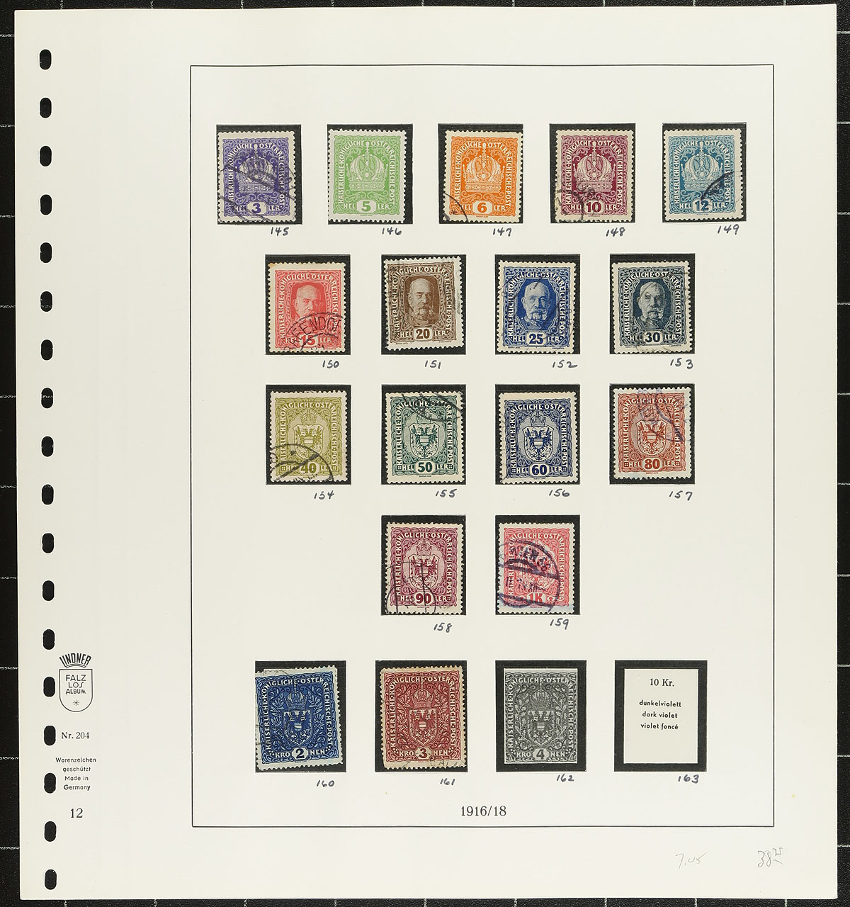 Collection of mint and used Austria, 1860-1937, with roughly 350 stamps neatly organized in hingeless Lindner album pages. The collection ranges from Scott #14/389, noting singles and sets with some material cataloguing $10 and up. Owner's 2008 Scott catalogue value totals US$718.00. Postmark interest include cds types, double ring, fancy, and a few other cancel types, including a few "socked on the nose" town cancels. A nice lot that should be continued, a few small faults noted, overall fine to very fine. Estimate =