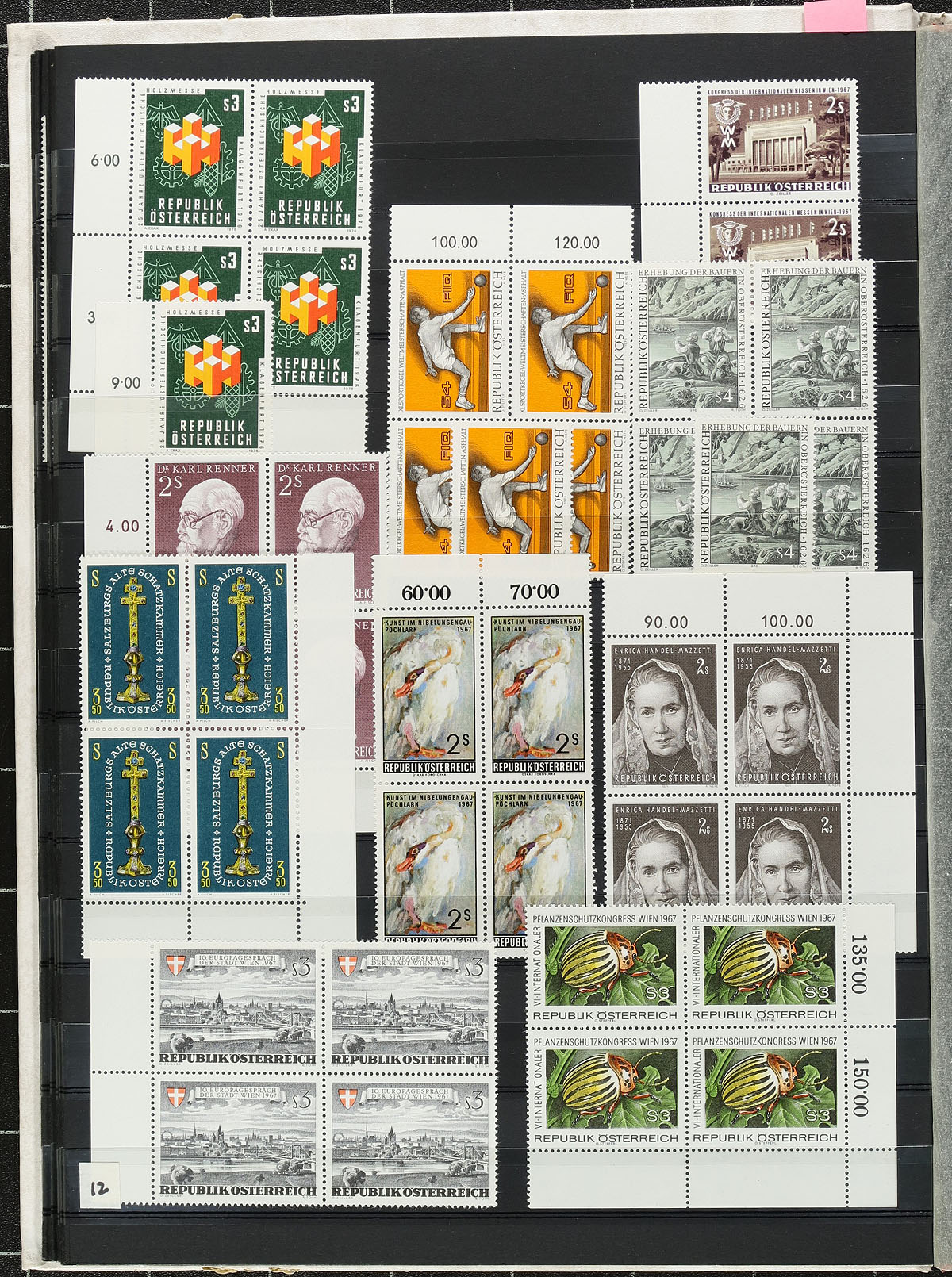 Clean collection / accumulation of primarily mint Austria, 1960's-1977, containing a few thousand stamps neatly organized in two stockbooks. The lot generally contains sets, blocks, strips, and some plate blocks, including selections of semi-postal issues. Owner's 2006 Scott catalogue value for the lot totals US$786.00. Duplication ranges from 2 to 8 for some sets with online photos showing a sampling. A nice clean lot for the collector or dealer, overall fine to very fine. Estimate =