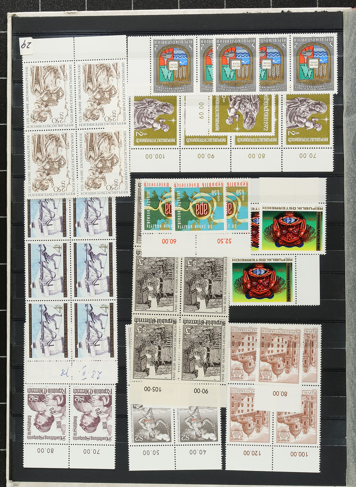 Clean collection / accumulation of primarily mint Austria, 1960's-1977, containing a few thousand stamps neatly organized in two stockbooks. The lot generally contains sets, blocks, strips, and some plate blocks, including selections of semi-postal issues. Owner's 2006 Scott catalogue value for the lot totals US$786.00. Duplication ranges from 2 to 8 for some sets with online photos showing a sampling. A nice clean lot for the collector or dealer, overall fine to very fine. Estimate =