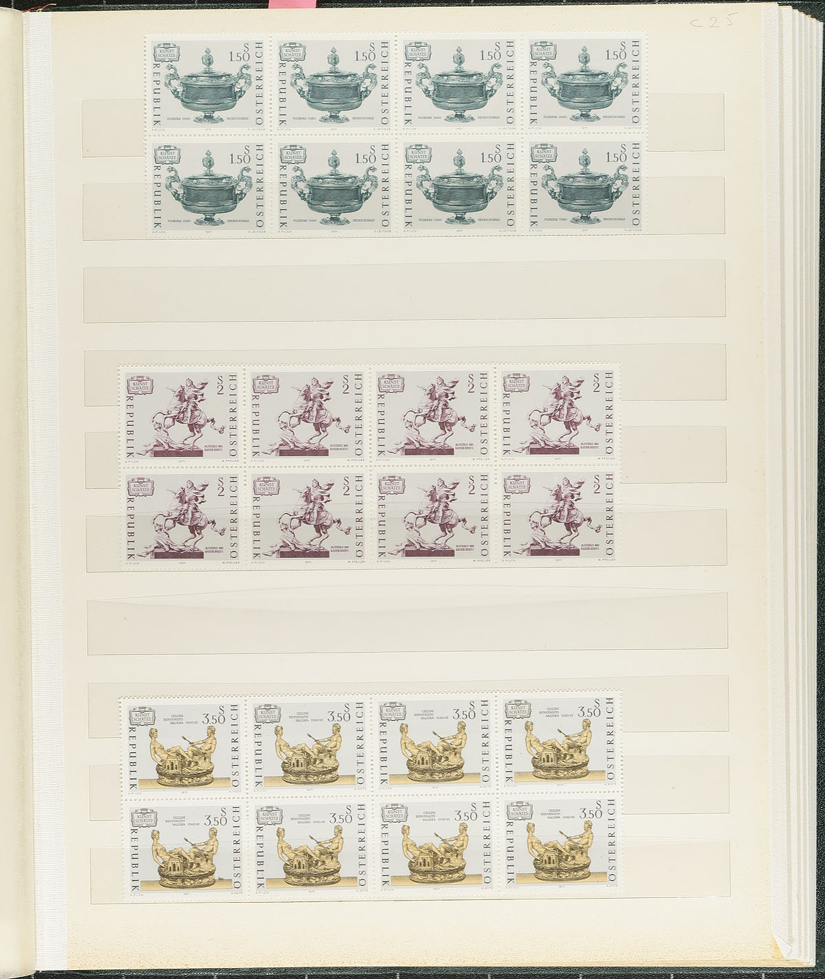 Clean collection / accumulation of primarily mint Austria, 1960's-1977, containing a few thousand stamps neatly organized in two stockbooks. The lot generally contains sets, blocks, strips, and some plate blocks, including selections of semi-postal issues. Owner's 2006 Scott catalogue value for the lot totals US$786.00. Duplication ranges from 2 to 8 for some sets with online photos showing a sampling. A nice clean lot for the collector or dealer, overall fine to very fine. Estimate =