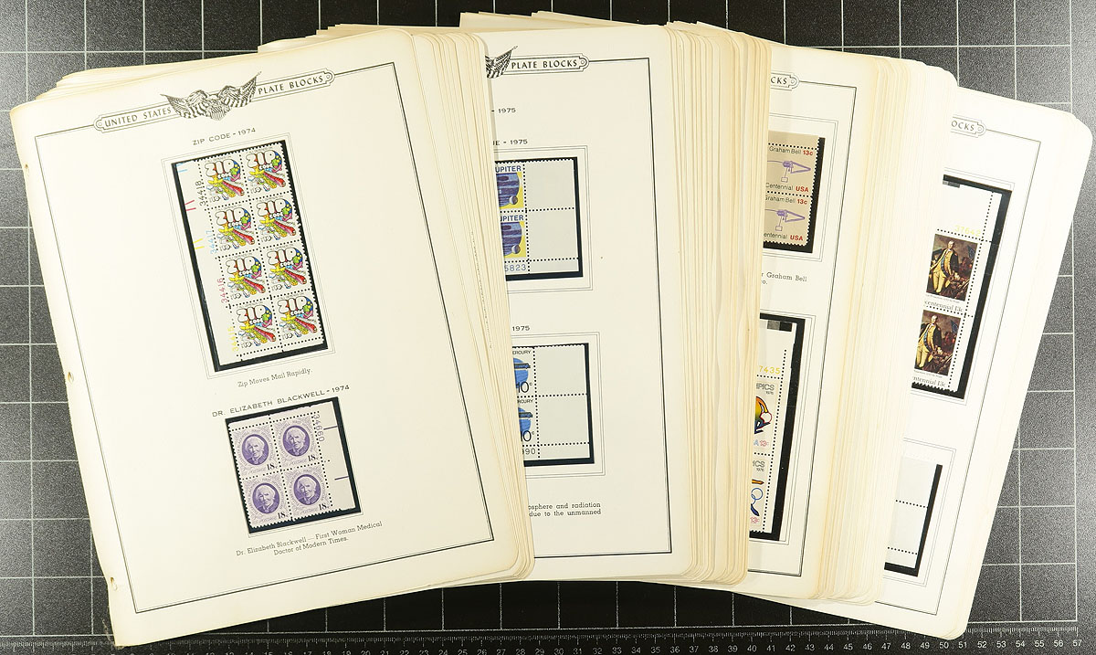 Large collection / accumulation of never hinged United States plate blocks, 1940's-1980, containing several hundred of plate blocks (many in larger blocks and multiples). The lot generally ranges from Scott #943/1841 in two formats, noting a few hundred in hingeless album pages (from 1974 to 1980), and many hundred in individual glassines. Catalogue value would be several hundred dollars, with face value alone just over US$200.00 A nice clean lot for all collectors. Estimate =